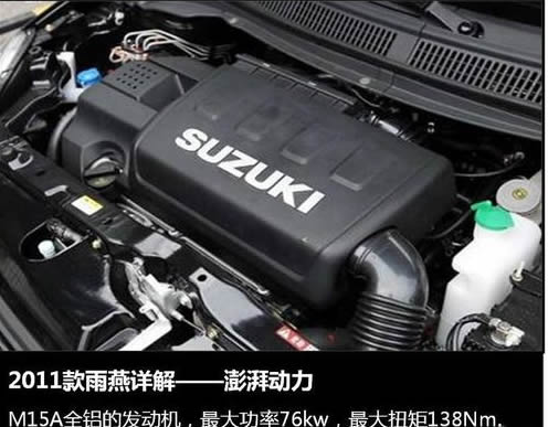 2011款鈴木雨燕共有1.3L和1.5L兩種排量的車型,其中鈴木雨燕1.5L排量的車型配備的是M15發(fā)動機(jī),最大功率為76千瓦,最大扭矩為138牛米,整體動力表現(xiàn)不錯,起步比較敏捷,而且擁有不錯的經(jīng)濟(jì)性,M系列的發(fā)動機(jī)最低油耗僅有5.3L,但相比之下,1.5L發(fā)動機(jī)顯然更能發(fā)揮出雨燕運(yùn)動性能小車的特點。
