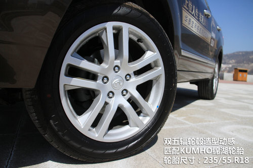 試駕的這款車型為寶利格的低配版,雖然是低配版也配置了動(dòng)感十足的運(yùn)動(dòng)型鋁合金輪轂,與之匹配的是錦湖235/55R18輪胎,應(yīng)該說(shuō)至少在尺寸上不輸于競(jìng)品,但是其抓地性一般。