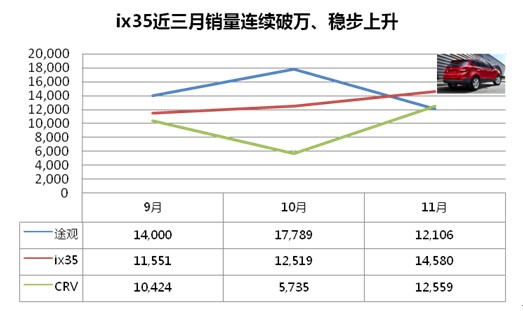 11月,北京現(xiàn)代ix35售出14,580輛,擊敗東風(fēng)本田CR-V、上海大眾途觀,再次成為國內(nèi)SUV市場月銷量冠軍。這已經(jīng)是ix35連續(xù)三月銷量突破1萬輛大關(guān)。與途觀、CR-V出現(xiàn)的大幅波動不同,ix35的市場表現(xiàn)顯得十分穩(wěn)定,在進(jìn)入9月后銷量一直穩(wěn)步上升,并登頂銷量榜單。與此同時(shí),ix35的其同門兄弟途勝也在11月售出5000輛,名列榜單第六。