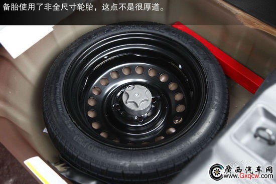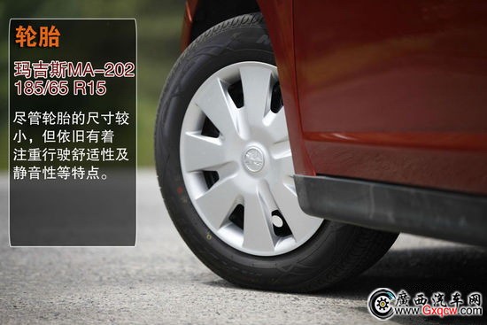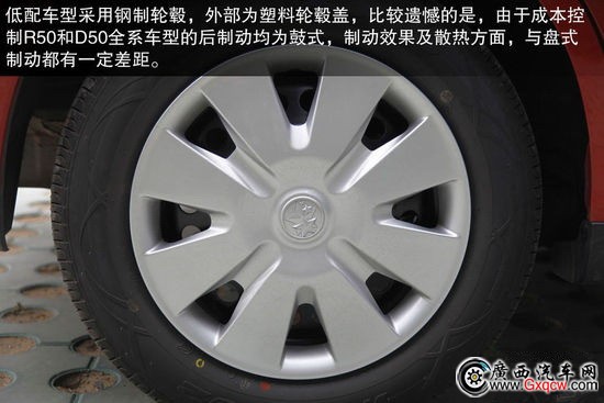 采用了瑪吉斯輪胎,規(guī)格為185/65 R15。輪胎特點(diǎn)為注重行駛舒適性及靜音性,備胎使用了非全尺寸輪胎。并且比較遺憾的是,由于成本控制R50和D50全系車型的后制動(dòng)均為鼓式,制動(dòng)效果及散熱方面,與盤式制動(dòng)都有一定差距。