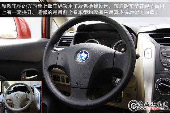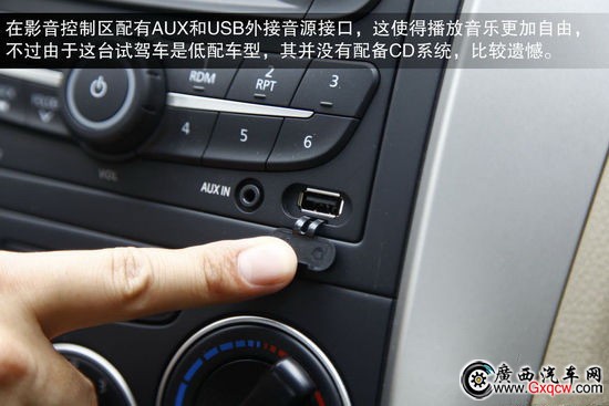 新款車型的方向盤車標(biāo)采用了彩色徽標(biāo)設(shè)計(jì),較老款車型在視覺效果上有一定提升。遺憾的是目前全系車型均沒有采用真皮多功能方向盤便利性有待提升。中控臺(tái)分區(qū)很清晰,旋鈕和按鍵的手感都很不錯(cuò)。在影音控制區(qū)配有AUX和USB外接音源接口,這使得播放音樂更加自由,不過由于這臺(tái)試駕車是低配車型,其并沒有配備CD系統(tǒng),比較遺憾。