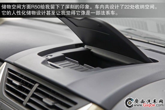 值得肯定的是在車內(nèi)的儲(chǔ)物空間方面,R50給我留下了深刻的印象,儲(chǔ)物盒或儲(chǔ)物槽非常豐富,這甚至讓我覺得它是一部法系車,人性化儲(chǔ)物空間非常充裕。車內(nèi)共設(shè)計(jì)了22處收納空間滿足隨時(shí)隨地的儲(chǔ)物需求。