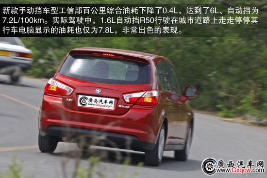 經(jīng)過多方面的升級(jí),新款手動(dòng)擋車型工信部百公里綜合油耗下降了0.4L,達(dá)到了6L、自動(dòng)擋為7.2L/100km。實(shí)際駕駛中,1.6L自動(dòng)擋R50行駛在城市道路上走走停停其行車電腦顯示的油耗也僅為7.8L,非常出色的表現(xiàn)。