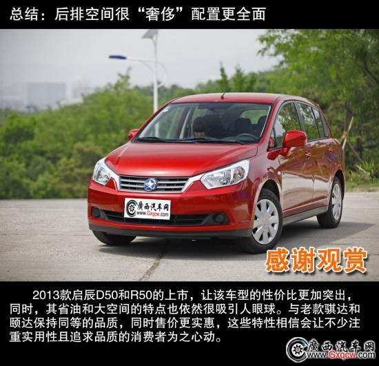 2013款啟辰D50和R50在外形、車身顏色、配置以及變速箱方面都有著一定程度的升級(jí)或改進(jìn)?梢哉f新款車型在性價(jià)比方面,以及燃油經(jīng)濟(jì)性方面都有所提升。