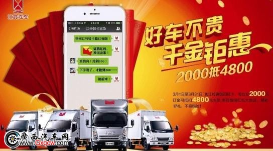 4月,購(gòu)江鈴輕卡不僅可以搶微信紅包,額外享受“2000元抵4800元”的現(xiàn)金優(yōu)惠,即凡在4月1日~4月30內(nèi)購(gòu)買(mǎi)江鈴真國(guó)四的客戶(hù),在達(dá)成訂車(chē)協(xié)議后,預(yù)交2000元現(xiàn)金,可抵扣4800元購(gòu)車(chē)款,搶得的紅包金額可以直接抵扣等額車(chē)款。鉅惠仍在繼續(xù),歡迎到店選購(gòu)。