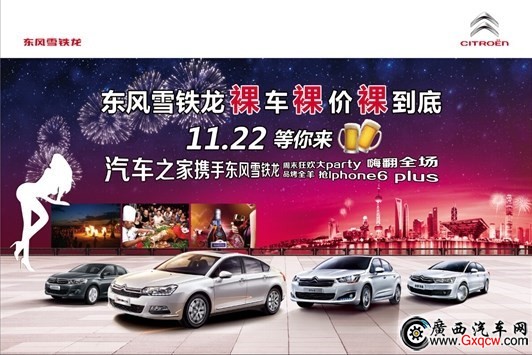 那么問題來了,團(tuán)購力度哪家強?找東風(fēng)雪鐵龍11.22裸車裸價裸到底,南寧車市一股購車狂歡大派對正席卷而來! 11月22日,汽車之家攜手東風(fēng)雪鐵龍舉辦“裸車裸價裸到底”活動鄭重承諾,價格突破底線,全年最低,買貴補差價,不需您勞心勞力砍價,只需動動您的手指,就能輕松獲得底價,到店試駕即送法國高檔紅酒一支!參與活動不僅能享受特惠價格,當(dāng)天購車還可參加抽獎活動,Iphone6 plus,52電視機(jī),Ipad mini,山地自行車,拉桿箱等等多重豪禮拿到你手軟,購車后上傳發(fā)票還可再獲得汽車之家送出的金屬質(zhì)感車標(biāo)哦!當(dāng)天前20名訂車的網(wǎng)友均可獲贈價值580元的拉桿箱一個。來吧!周末帶上您的家人,加入我們的狂歡大派對,吃個夠喝個夠玩?zhèn)夠!