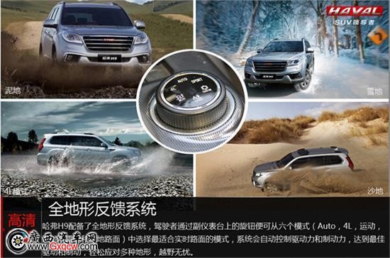 越野性方面,哈弗H9標(biāo)準(zhǔn)型標(biāo)配的是智能電控四驅(qū)(AUTO2H4H4L),而哈弗H9豪華型和超豪華型標(biāo)配的則是全地形反饋系統(tǒng)(AUTO、運(yùn)動(dòng)、沙地、雪地、泥地、4L)以及電子式差速鎖,哈弗H9標(biāo)準(zhǔn)型和豪華型可以選裝電子式差速鎖。全地形反饋系統(tǒng)的操作也非常簡單,駕駛者通過副儀表臺(tái)上的多功能顯示器旋鈕,便可從六個(gè)模式中選擇最適合實(shí)時(shí)路面的模式,系統(tǒng)會(huì)自動(dòng)控制驅(qū)動(dòng)力和制動(dòng)力,達(dá)到**驅(qū)動(dòng)和制動(dòng)。