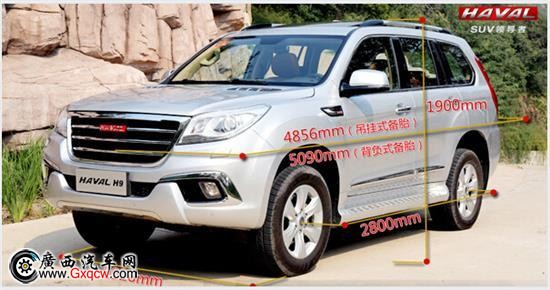 作為哈弗系列SUV的旗艦車型,哈弗H9的車身尺寸非常寬大,長寬高為4856mm(吊掛式備胎)/5090mm(背負(fù)式備胎)×1926mm×1900mm,軸距2800mm,明顯比同規(guī)格的SUV車型大一圈,車內(nèi)空間寬敞,霸氣十足。