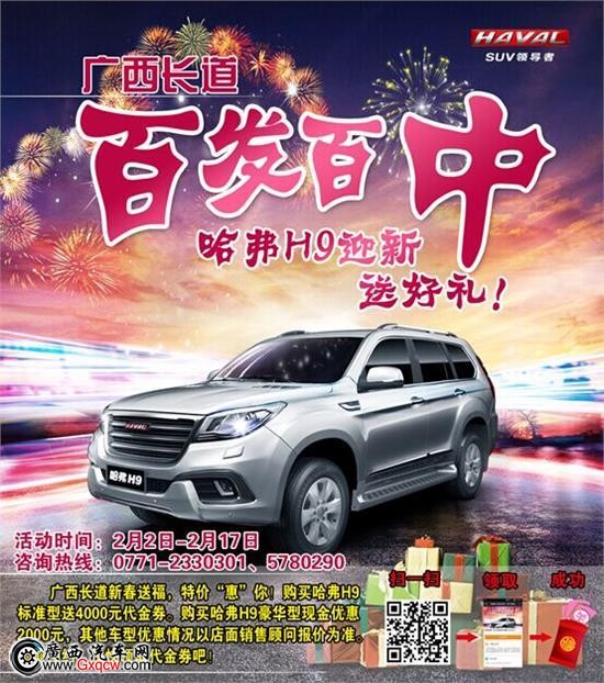 即日起到店訂購哈弗H9,現(xiàn)車任選任提!廣西長道長城、哈弗4S店還有多重新年好禮送給您!