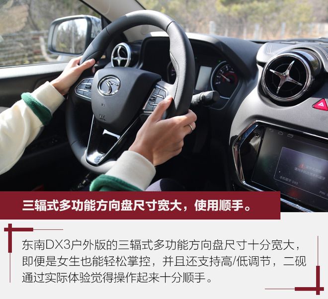 東南DX3戶外版豐富的配置水平令二硯印象深刻,諸如倒車雷達、倒車影像、感應(yīng)雨刷、多功能方向盤、自動空調(diào)等便利配置應(yīng)有盡有,同時新車的多媒體系統(tǒng)功能也十分強大,相較新車8.09、9.79萬元的價格來看,二硯覺得十分超值。