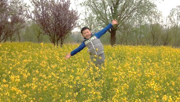 ”小家伙在油菜花地里撒野撒歡呢“