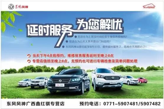 隨著8月的準(zhǔn)備離去,東風(fēng)風(fēng)神7-8月服務(wù)活動(dòng)也圓滿成功。期間,我們?yōu)榈降瓯pB(yǎng)維修客戶準(zhǔn)備了延時(shí)服務(wù)!保養(yǎng)維修六重禮!舉行了東風(fēng)風(fēng)神廣西鑫紅騏夏季雨季用車安全及兒童戲水安全主題車主課堂!
