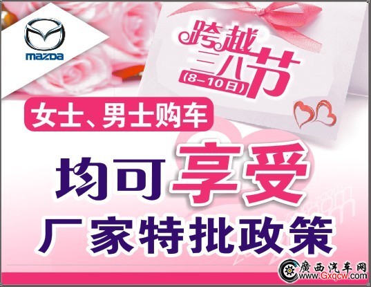 在最美麗的3.8女人節(jié),廣西鑫廣達(dá)一汽馬自達(dá)為您特別推出“時尚女人節(jié)購車也瘋狂”活動。3月8-10日,跨越女人節(jié),男士、女士購車均可享受廠家特批優(yōu)惠政策,*高優(yōu)惠達(dá)萬元,選擇一汽馬自達(dá),選擇廣西鑫廣達(dá)4S店,讓您的有車生活從此更加甜蜜幸福!